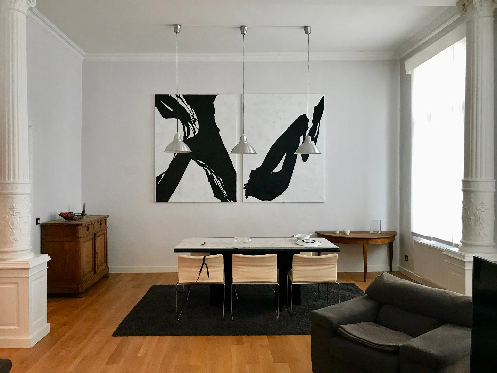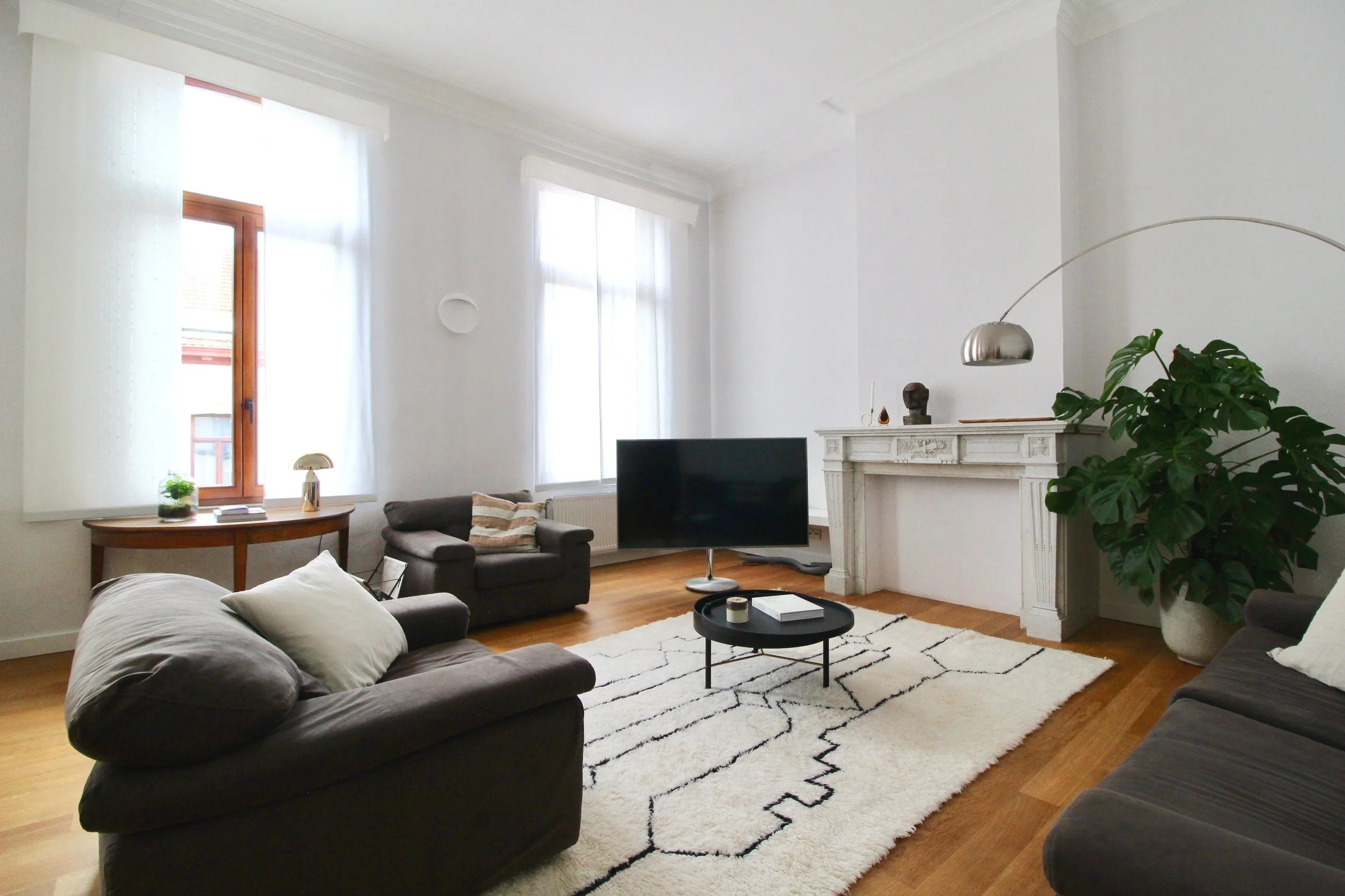 De eigenaar van dit prachtige expatappartement in Brussel besloot dat het tijd was om de woning op te frissen. Say no more! We hebben met het bestaande meubilair gewerkt, maar we hebben de indeling veranderd, het donkere tapijt vervangen, een nieuwe salontafel geplaatst en veel mooi textiel, planten en accessoires toegevoegd om een instant thuisgevoel te creëren.